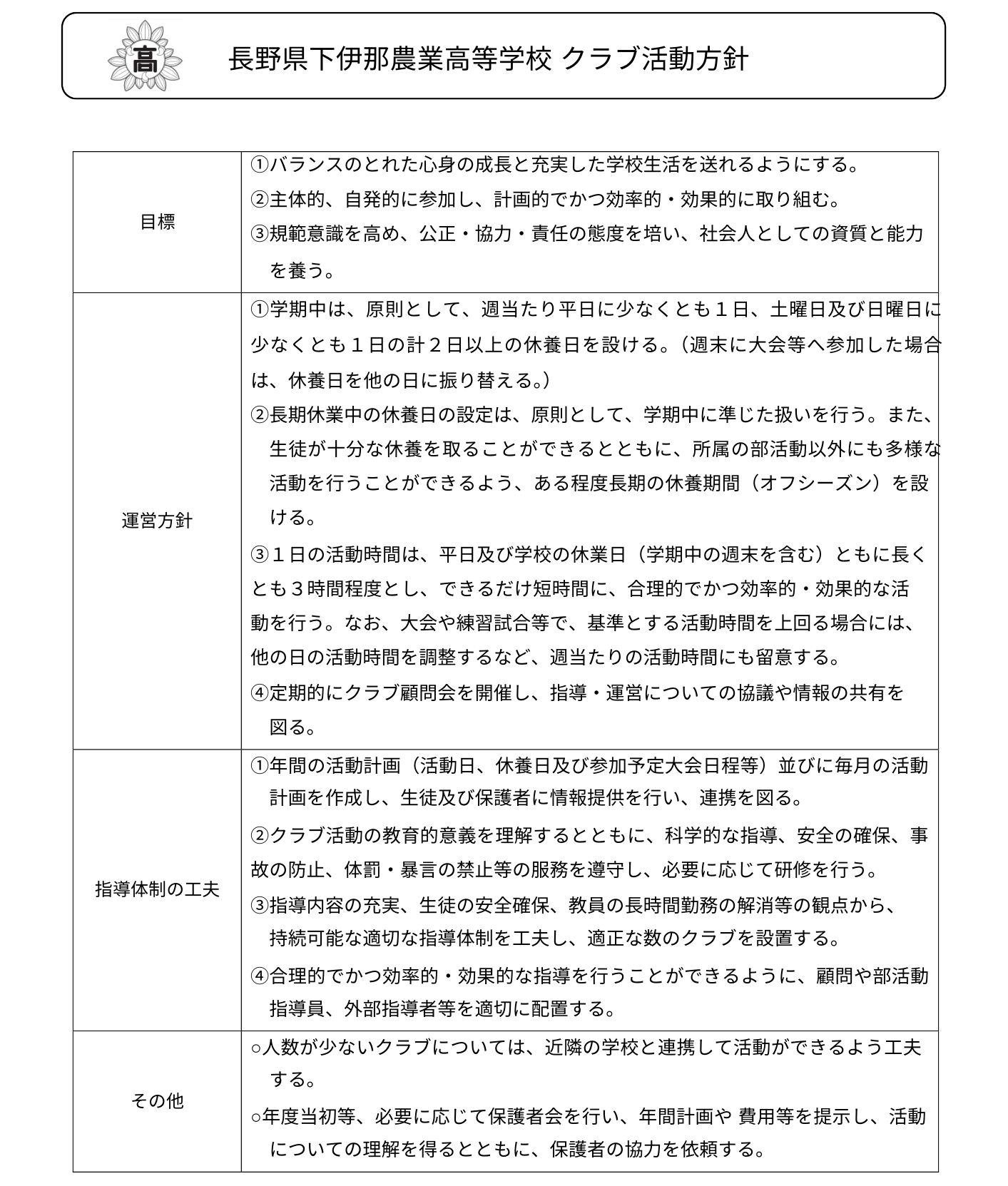 質実・剛健、誠実・堪能、積極・真摯を教育目標に掲げている長野県下伊那農業高等学校
