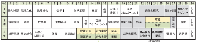 地域の主力農作物である果樹(くだもの)の楽手を核に、果樹栽培から利活用・流通・経営までの知識と技術を幅広く学びます。